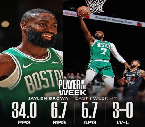 杰伦-布朗在上周共出战3场比赛,场均能够得到34分6.7个篮板5.7次助攻。在布朗参加的3场比赛当中,凯尔特人保持了全胜战绩,目前球队的连胜已经来到了5场。
