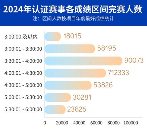 随着后续路跑赛事的极速发展,比赛场次、比赛规模、大众成绩都大幅上涨。据中国路跑蓝皮书显示,2024年马拉松赛事共有254场(认证赛事为180场),总规模为116.64万人次(认证赛事规模为100.3万人次),最终认证赛事中完赛人数为34.54万人,其中破三人数为18015人(其中男子17275,女子740)人,相较2023年破三的11897人,增加了6118人。据不完全统计,2025年中国马拉松全马破三总人数约为2.5万-2.8万人。