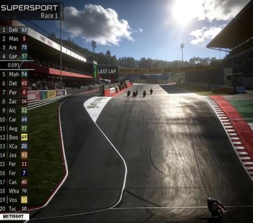 世界超级摩托车锦标赛(WSBK)葡萄牙站,法国车手瓦伦丁·德比斯驾驶着一辆编号53的红色赛车,在最后一圈仍然保持领先。当他冲过终点线时,计时器显示:领先第二名3.685 秒。