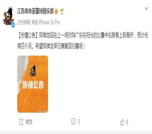 如今江苏男篮官方伤病报告显示:“郑祺龙因在上一场对阵广东男篮的比赛中右腓骨上段骨折,预计伤停四个月,希望郑祺龙早日康复回归赛场!