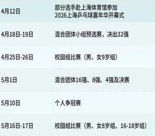 ·4月25-26日,混合团体冠军联赛杨浦区选拔赛。将选拔优秀选手组成杨浦区代表队参加市级循环赛。选拔赛主会场位于复兴岛船台PARK,周边将同步举办乒乓球嘉年华市集活动——亲子乒乓挑战赛、趣味乒乓运动体验、特色商户摊位。