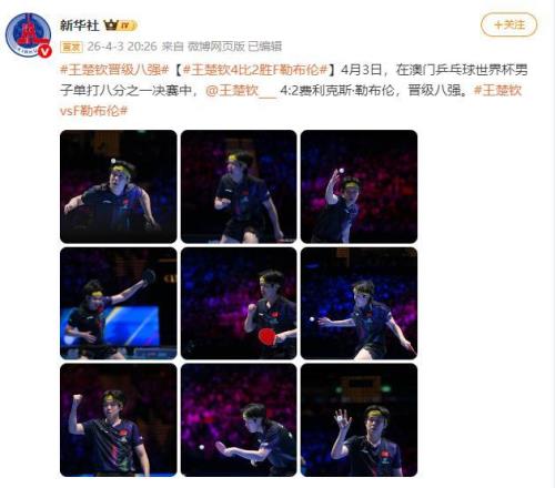据新华社消息,4月3日,在澳门乒乓球世界杯男子单打八分之一决赛中,王楚钦 4:2费利克斯·勒布伦,晋级八强。
