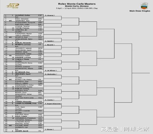 北京时间昨晚,ATP1000蒙特卡洛大师赛公布了单打正赛签表。卫冕冠军阿尔卡拉斯与辛纳、兹维列夫、穆塞蒂位列前四号种子。前八大种子对位:上半区,阿尔卡拉斯vs布勃里克、穆塞蒂vs德米纳尔;下半区,梅德维德夫vs兹维列夫、阿利亚西姆vs辛纳。
