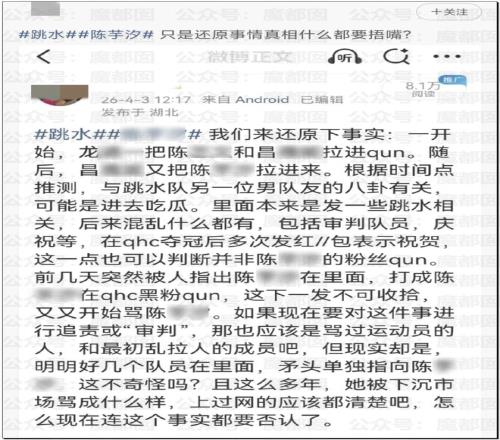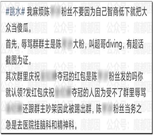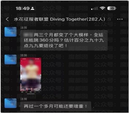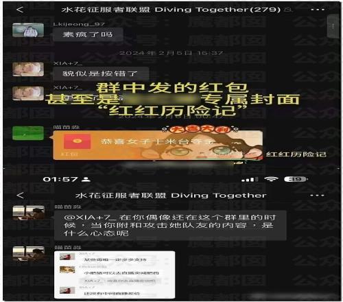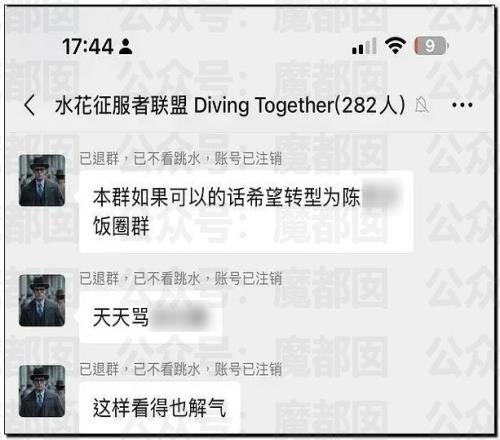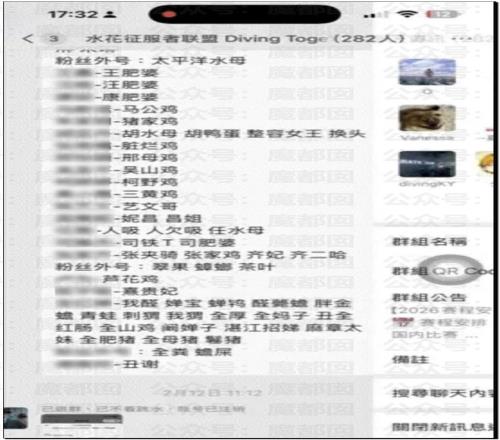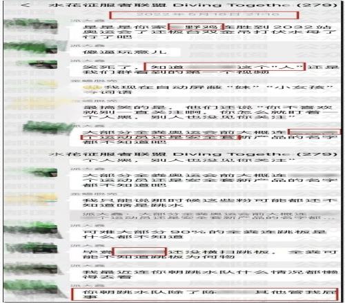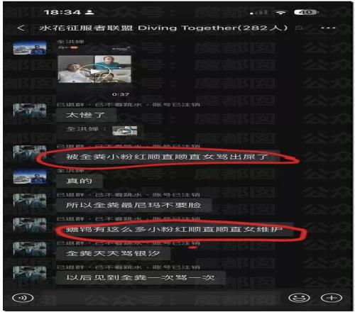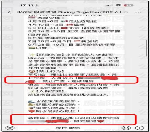有网友发现有个名字“水花征服者联盟”的微信群(282人)被曝光长期针对QHC进行人身攻击。群公告明确标注“禁止攻击其他运动员(QHC除外)”,并默许群成员对QHC使用大量侮辱性外号(如“母猪”“肥猪”)。
