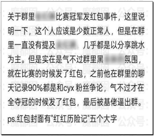 如果大家只是觉得这个是什么恶臭粉圈的行为,这个事情就不会如此发酵了,因为其中成员疑似包含CYX、CYN、CYW等现役冠军选手,还有很多官媒记者和运动员。