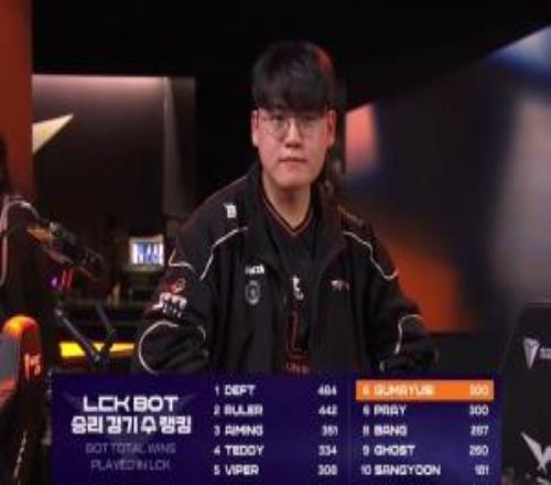体育资讯4月8日称 在今日的LCK第二赛段比赛上,HLE以2-0的比分击败DK,赛后官方数据显示Gumayusi拿下300胜,在LCK AD位列第六名!