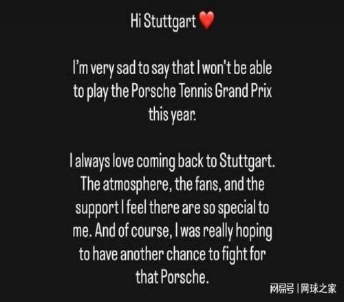 我们再来关注球员动态。北京时间昨晚,女单世界第一萨巴伦卡通过个人社交媒体宣布,她因伤决定退出WTA500斯图加特站的比赛。另外,去年十月份遭遇跟腱断裂的丹麦一哥鲁内在个人社交媒体上确认,他计划在5月17日举行的汉堡公开赛上重返赛场。