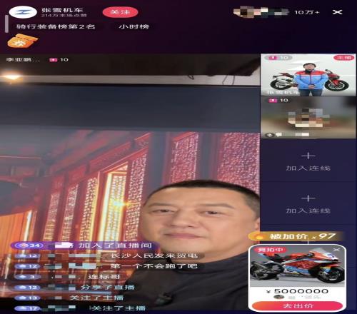 4月10日晚上8点,中国摩托车品牌张雪机车创始人张雪在其直播间拍卖WSBK夺冠车820复刻车赛车,并为拍卖设置了封顶价500万元。按照拍卖规则,竞拍者不能一次性出价500万,只有出价100万以上后一直点,先触达500万者得,有一定运气成分。