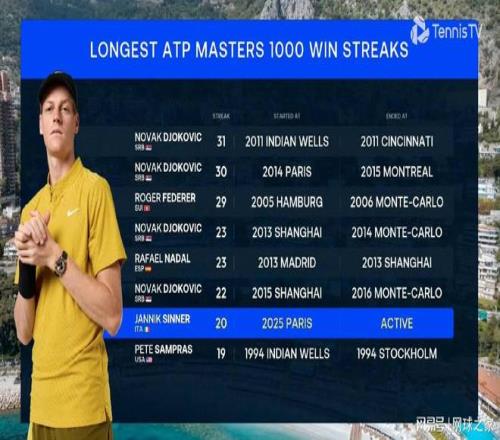 在2-0淘汰阿利亚西姆、取得对阵对手的五连胜之后,辛纳成为了历史上第四位能够取得ATP大师赛20连胜的男子单打选手,在他前面都有哪些人?他有望打破纪录吗?