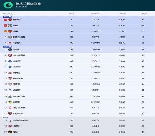 英超最新积分榜正式出炉:
