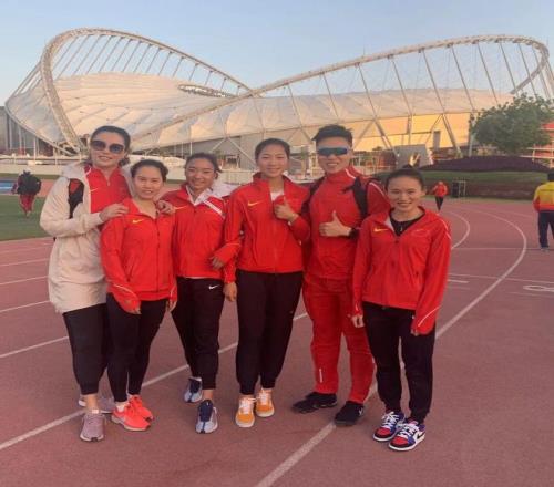 许双双(右1)与教练石鹏(右2)在多哈的合影