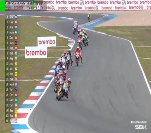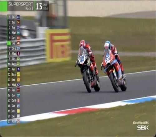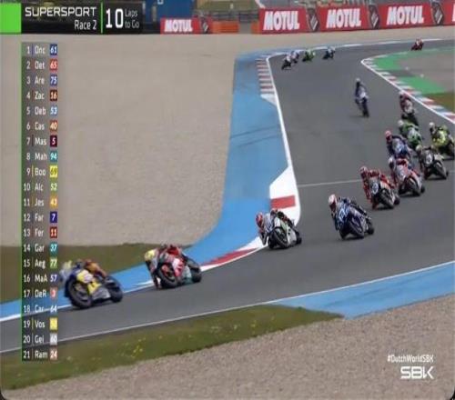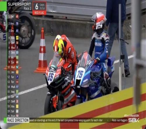 比赛还有6圈,场上出现红旗。根据规定,比赛圈数进行了三分之二后,选手不再需要完成剩余圈数,红旗发生时的排名为第二回合的最终成绩,张雪机车53号车手德比斯排名第七。