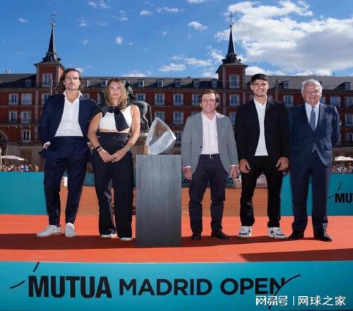 2024年马德里大师赛,卫冕冠军阿尔卡拉斯(右二)、萨巴伦卡(左二)与赛事总监F·洛佩兹(左一)一起出席开幕式活动