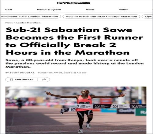 专业跑步媒体《跑者世界》的报道不只是记录萨维“破2”,而是从多个维度解释这场比赛为何具有时代意义。文章以“It happened!”开篇,强调萨维在伦敦跑出1小时59分30秒,成为首位在符合纪录认证条件的马拉松赛道上突破2小时的运动员,并将基普图姆的原世界纪录提升1分05秒。报道同时指出,这不是孤立的奇迹:凯杰尔查首马即以1小时59分41秒获得亚军,大幅刷新男子马拉松首秀纪录;基普里莫以2小时00分28秒获得第三,也快过旧世界纪录。