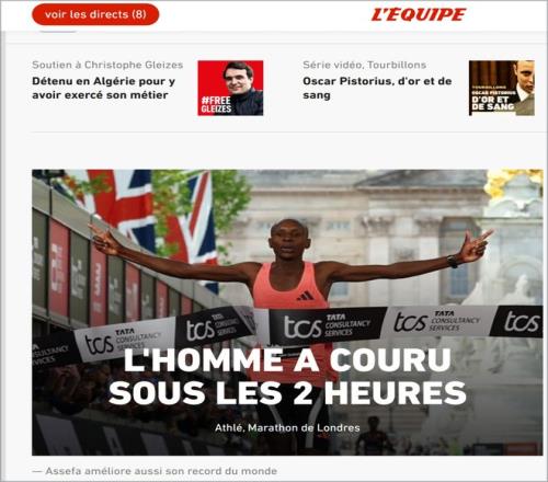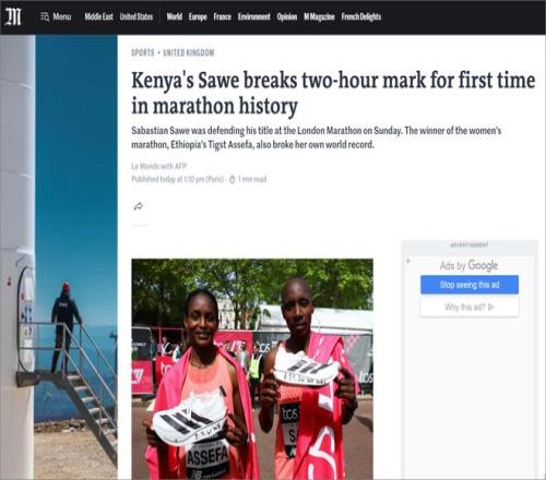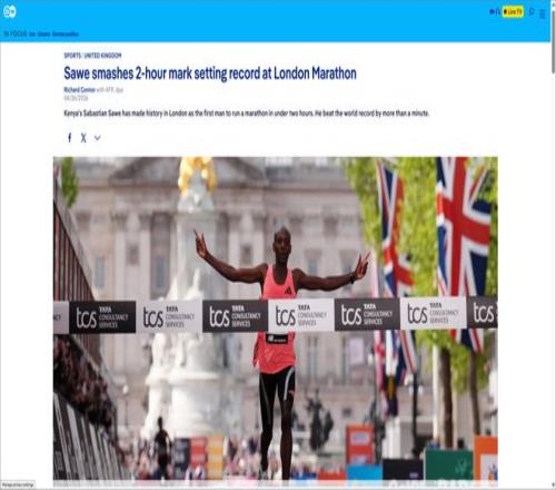 法国《世界报》以法新社稿件形式报道萨维“破2”,重点强调这是马拉松史上首次在正式比赛中突破2小时。报道既对比了基普乔格2019年非正式“破2”与萨维此次世界纪录的区别,也提到萨维穿着重量低于100克的阿迪达斯Pro Evo 3超级跑鞋参赛。女子组方面,《世界报》同样关注阿塞法以2小时15分41秒卫冕并刷新纯女子组世界纪录,使本届伦敦马拉松成为极具历史性的赛事。