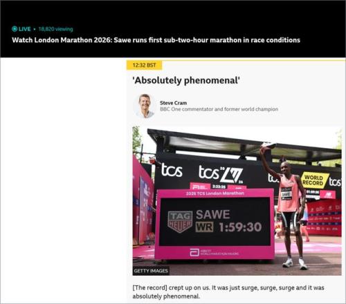 BBC 的报道更突出现场转播中的震撼感与人物情绪。评论员史蒂夫·克拉姆称,纪录是在萨维一次次加速中“悄然逼近”的,自己从未见过这样的冲刺;保拉·拉德克利夫则评价说,马拉松运动的标尺已经被重新移动。BBC 还用配速数据呈现萨维后程越跑越快:35公里后平均配速从每公里2分47秒提升到2分45秒,最后阶段达到2分40秒。萨维赛后感谢伦敦观众,称这一天的成就“不只属于我,也属于伦敦的所有人”。