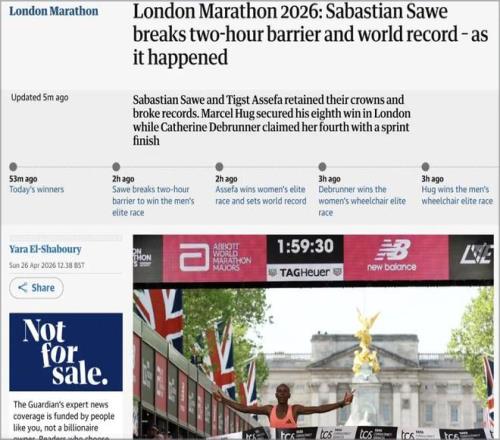英国《卫报》以全程直播方式记录2026年伦敦马拉松,将萨维的“破2”与阿塞法刷新女子纯女子组世界纪录、胡格第八次伦敦夺冠、德布伦纳冲刺取胜并列呈现,称这是伦敦马拉松又一个纪录之日。记者肖恩·英格尔在 The Mall 现场写下文字,称萨维被称作“沉默的刺客”,但他在伦敦街头完成的是“美丽的毁灭”——他将基普图姆的原纪录提升65秒,“彻底粉碎”了这一纪录。萨维赛后表示,这一天“不只属于我,也属于伦敦的每一个人”。