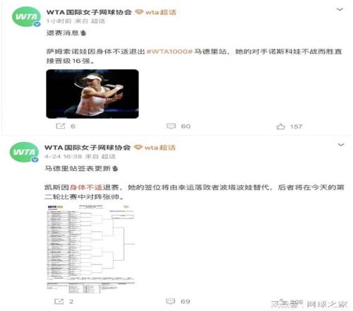 继斯瓦泰克昨天因病退赛后,今天俄罗斯名将萨姆索诺娃也因身体不适宣布退赛,而美国新星高芙也在比赛中出现呕吐等严重不适症状,但她最终还是顽强逆转科斯蒂亚。