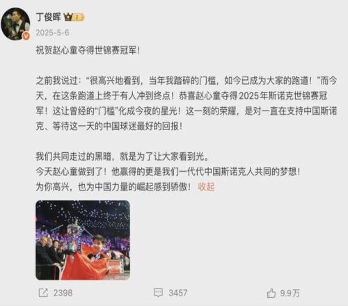 丁俊晖夺冠那天,是赵心童的8岁生日。两人生日仅相距2天,年龄刚好相差10岁。赵心童说,自己的梦想是像丁俊晖那样成为斯诺克冠军。