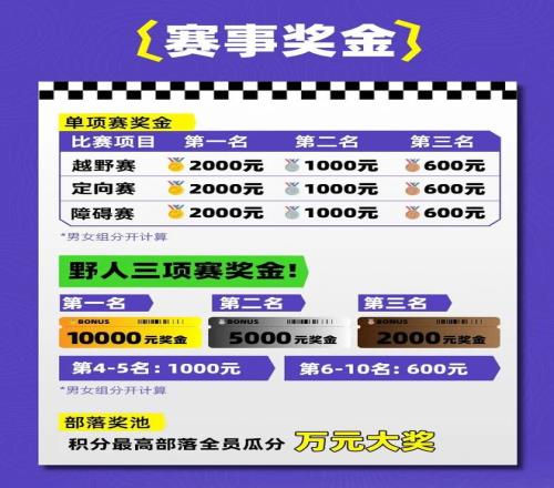单项赛和三项赛都有个人奖金,男女组分开计算,最高10000元。