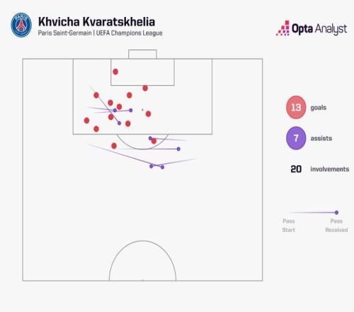 据Opta Analyst统计,自2025年1月加盟巴黎圣日耳曼以来,克瓦拉茨赫利亚已经在欧冠赛场直接参与20粒进球,包括13粒进球和7次助攻。同期没有任何球员在欧冠中的参与进球数比他更多。